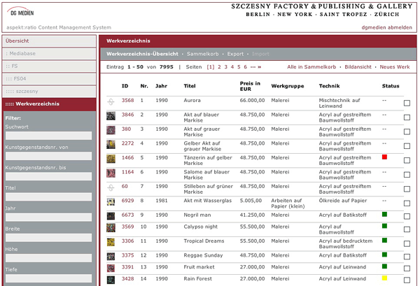 Die neue CMS-basierte Werkdatenbank mit integrierter Adressverwaltung wurde auf Basis eines aspekt:ratio Frameworks entwickelt. Diese DG Medien-Eigenentwicklung bietet eine umfangreiche Verschlagwortung der Kunstwerke mit einer dem Bedarf des Künstlers entsprechenden maximalen Informationstiefe. So können für den Künstler und Kunst-Experten relevante Informationen zu Papierqualität, Farbtyp, Maltechnik sowie derzeitiger Standort und Zeitdauer des jeweiligen Einsatzes abgefragt werden.