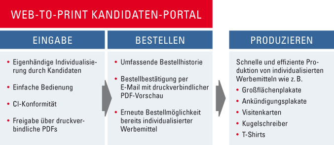 Die Kandidaten gelangen über das vorhandene CDU Intranet automatisch in das Web-to-Print Portal. Alle dort hinterlegten Werbemittel-Vorlagen enthalten die jeweils persönliche Kandidaten-Information (Bild, Name), sodass der Individualisierungsprozess eigenhändig und schnell vorgenommen werden kann. Eine druckverbindliche Vorschau ist dabei als Standard-Funktion im Web-to-Print Portal integriert, unabhängig davon, ob es sich um ein Ankündigungsplakat, ein Großflächenplakat, einen Kugelschreiber oder die Team-Ausstattung handelt. Das System bietet darüber hinaus die Möglichkeit, Vorlagen anzulegen und abzuspeichern oder diese zu verändern, um einen neuen Bestellvorgang auszulösen.