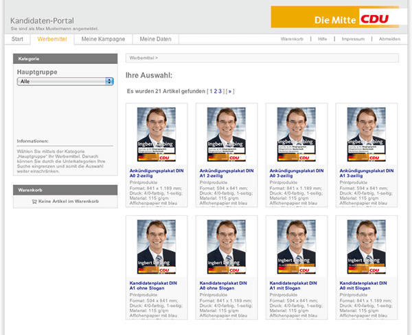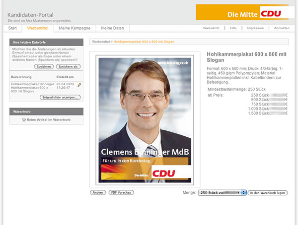Aufgabe war es, ein Online-Portal zu realisieren, das allen Kandidaten die Möglichkeit bietet, ihre Werbemittel für den Bundestagswahlkampf auf einfache Weise online zu individualisieren und zu bestellen. Der Herstellungsprozess sollte schneller und effizienter gestaltet werden und somit sollten die Produktionskosten gesenkt werden.